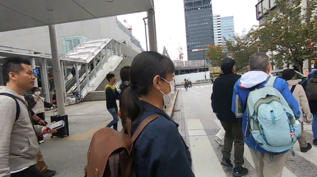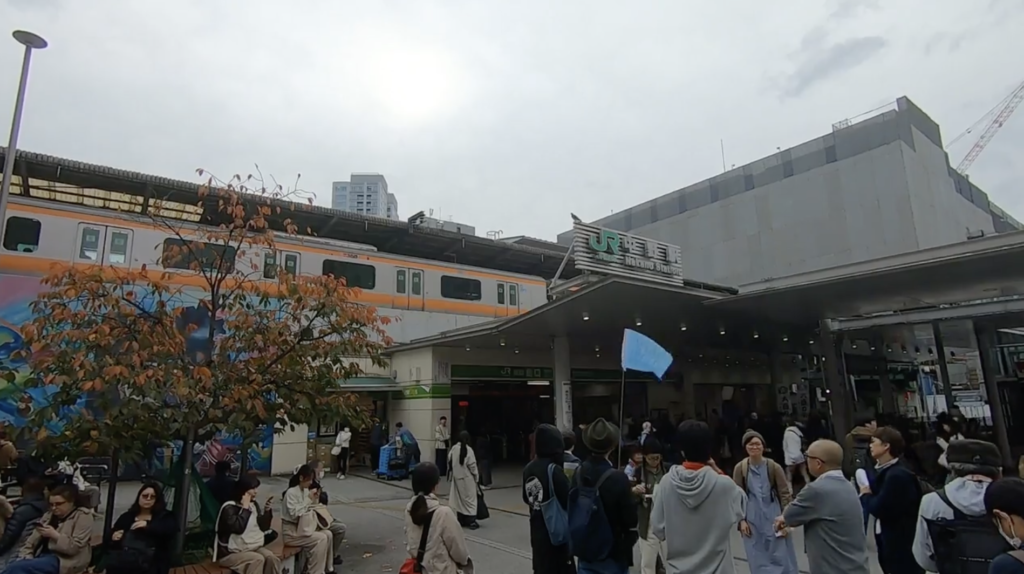 集合した中野駅北口。天気は曇り。青い旗が目印です。