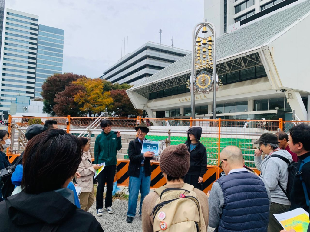 暗渠マニアックスさんのツアーの定番「天Qクイズ」では、サンプラザ周辺にまつわるさまざまな豆知識が出題されました。