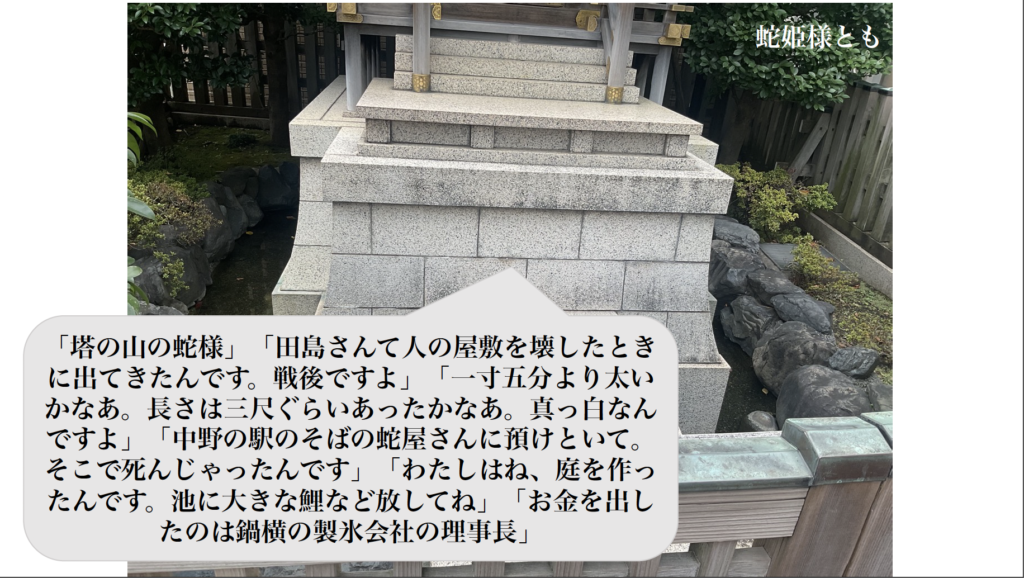 その白蛇ですが、かつてサンモール商店街に存在した「まむしや龍昇堂」というへびの店に預けられて、そこで死んじゃったとの口述記録もあるとか。